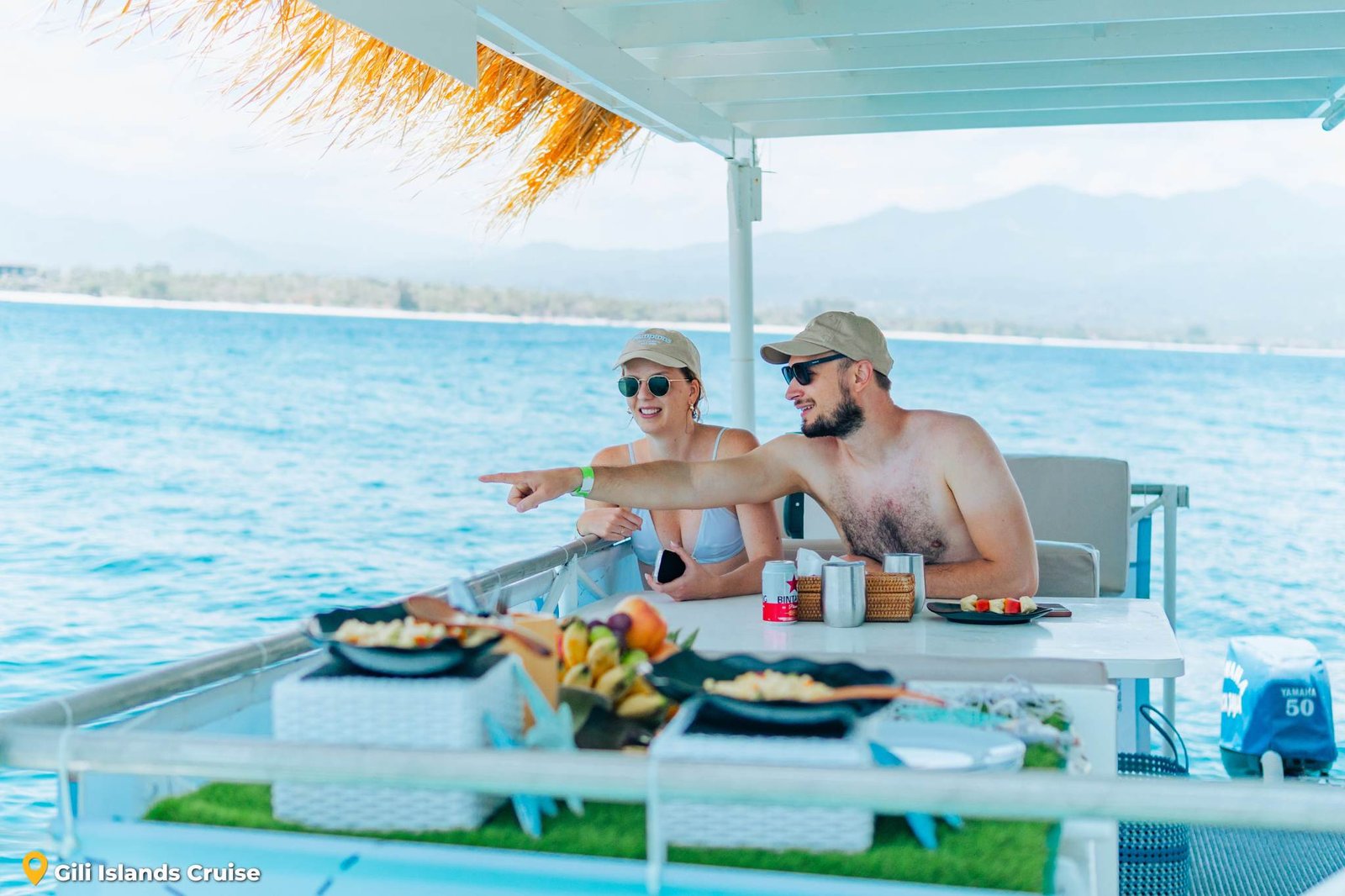 Back on the pontoon, enjoy a light BBQ lunch onboard as chilled mEnjoy a light BBQ onboard while relaxing to chilled music and soaking up ocean views as the sun begins to set during the cruise back to Gili Trawangan.usic plays and ocean views surround you while cruising back to Gili Trawangan
