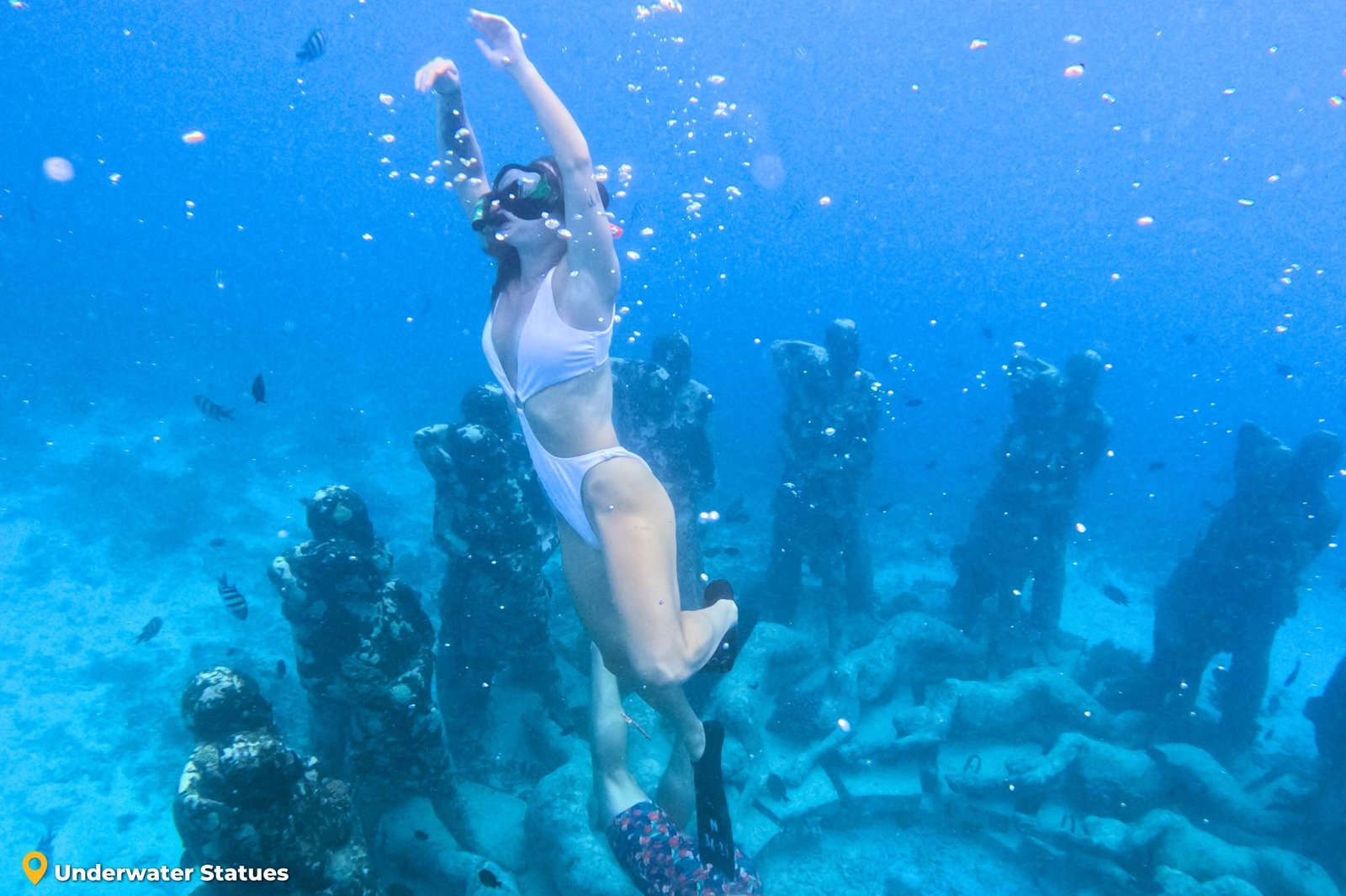Jump into the crystal-clear waters to explore underwater statues, surrounded by colorful coral reefs and tropical marine life.